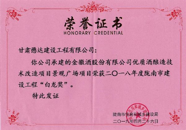 近日,在隴南市2019年建設(shè)工程質(zhì)量安全監(jiān)管工作視頻會議上,公司承建的金徽酒股份有限公司優(yōu)質(zhì)酒釀造技術(shù)改造項(xiàng)目景觀廣場項(xiàng)目榮獲2018年度隴南市建設(shè)工程“白龍獎”。