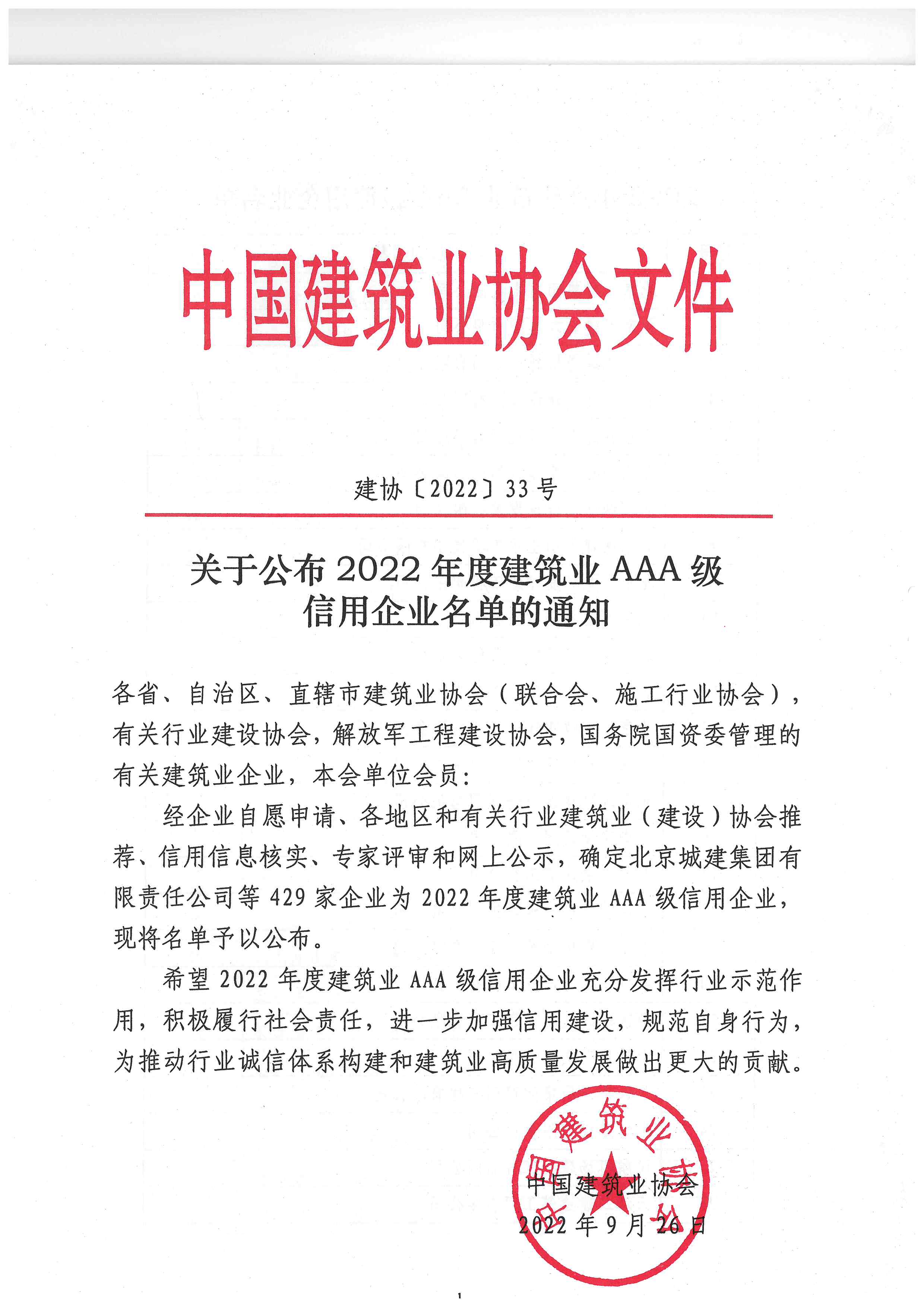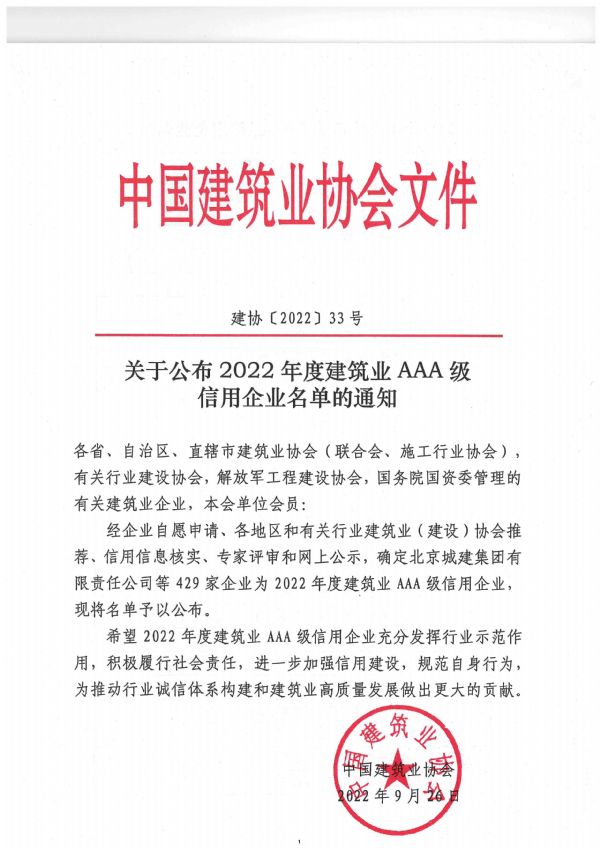 近日,從中國建筑業(yè)協(xié)會傳來捷報,公司獲評2022年度“建筑業(yè)AAA級信用企業(yè)”。