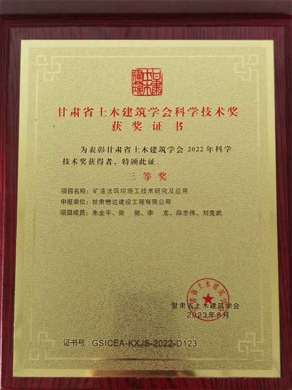 近日,甘肅省建設(shè)行業(yè)科技創(chuàng)新成果研討會(huì)暨頒獎(jiǎng)典禮在蘭州隆重舉行。甘肅懋達(dá)建設(shè)工程有限公司申報(bào)的“地下室結(jié)構(gòu)板耐磨地坪一次成活施工技術(shù)研究及應(yīng)用”和“礦渣法筑壩施工技術(shù)研究及應(yīng)用”分別榮獲2022年度甘肅省土木建筑學(xué)會(huì)科學(xué)技術(shù)三等獎(jiǎng),8名項(xiàng)目成員獲得大會(huì)表彰獎(jiǎng)勵(lì)。