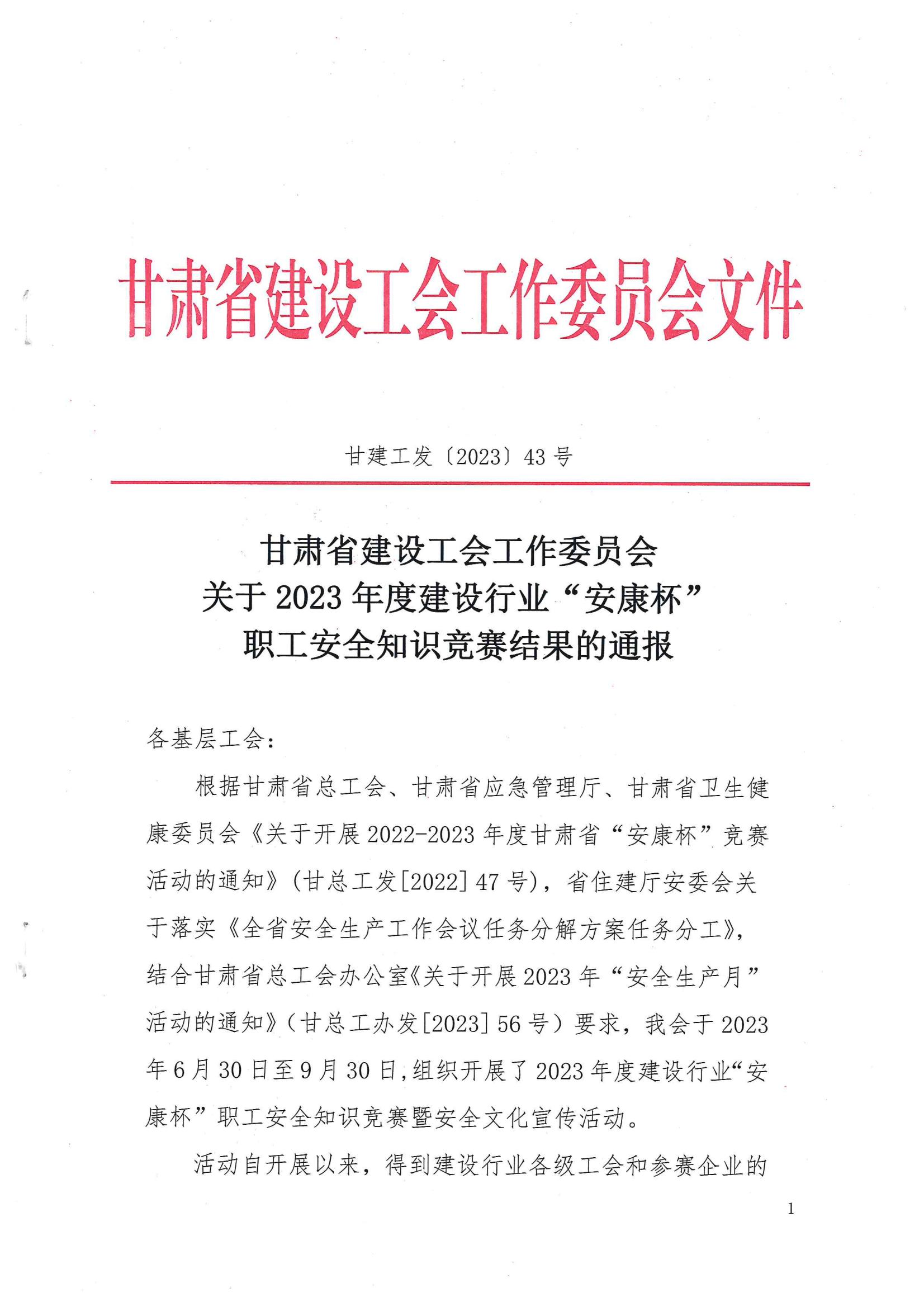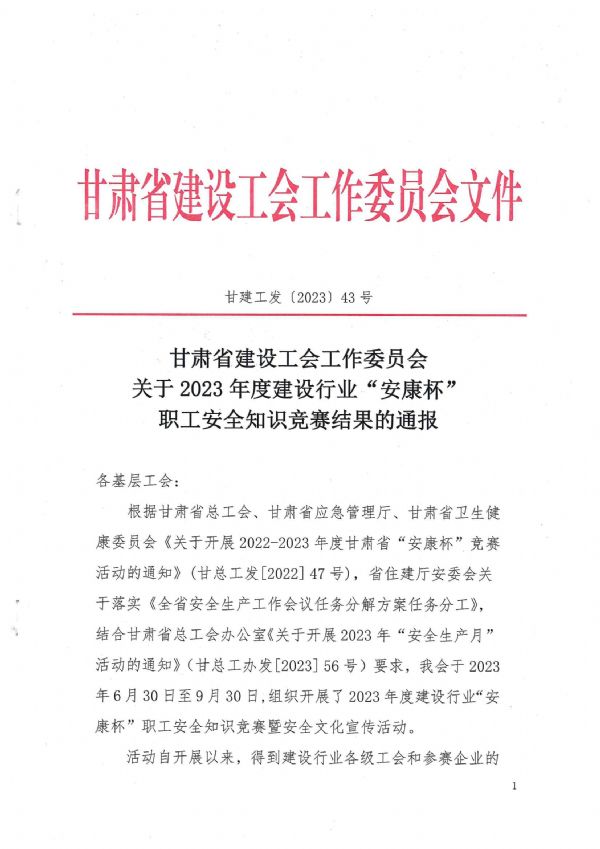 近日,甘肅省建設(shè)工會召開表彰大會,對在2023年度建設(shè)行業(yè)“安康杯”職工安全知識競賽暨安全文化宣傳活動中成績突出的企業(yè)、班組及個人進行表彰獎勵。