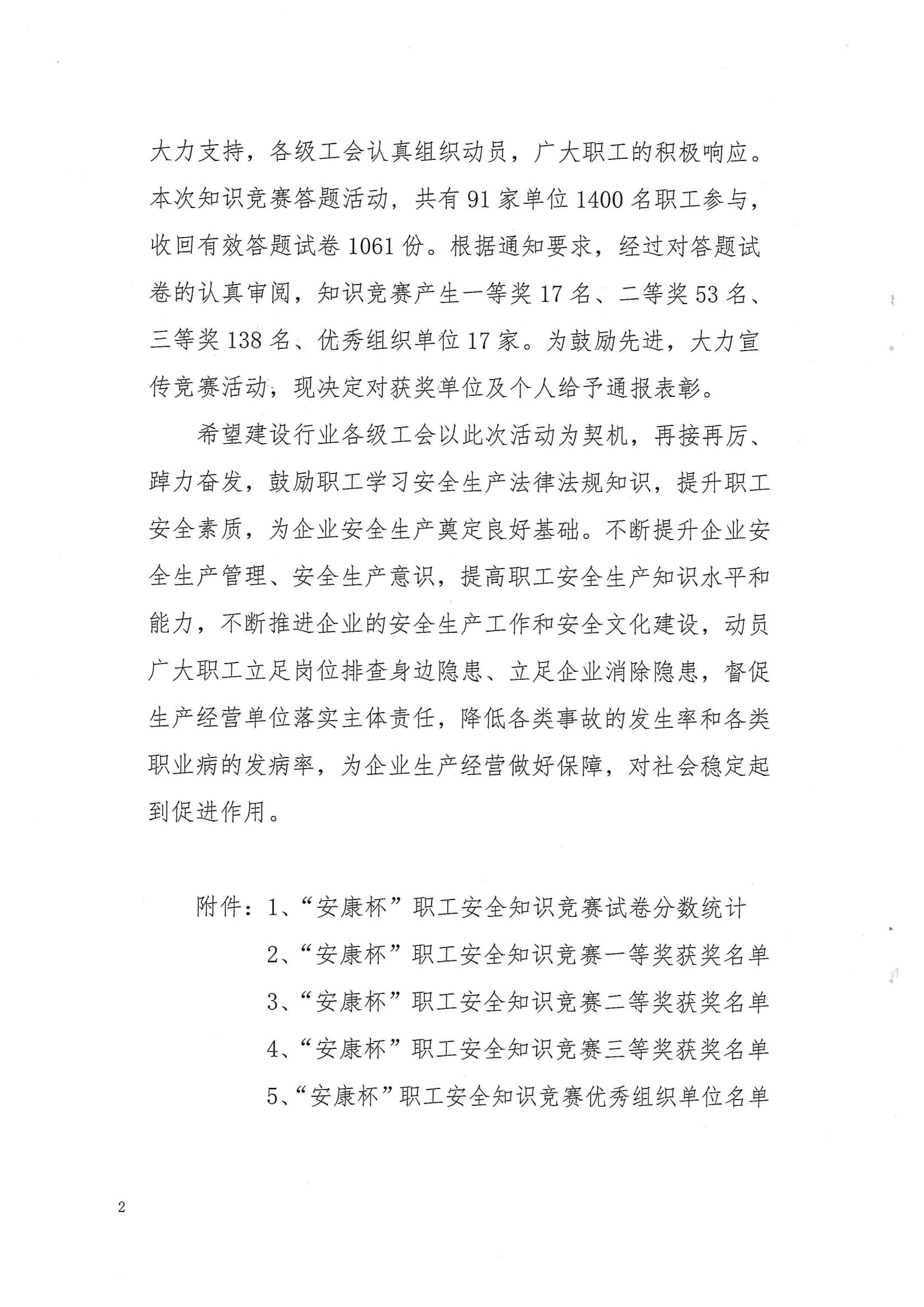 此次活動以“排查整治安全隱患、共促安全健康發(fā)展”為主題,于今年6月30日至9月30日,在全省組織開展了2023年度建設(shè)行業(yè)“安康杯”職工安全知識競賽暨安全文化宣傳活動。公司共有兩名員工榮獲“安康杯”職工安全知識競賽二等獎,八名員工榮獲三等獎,公司榮獲“安康杯”職工安全知識競賽“優(yōu)秀組織獎”。
