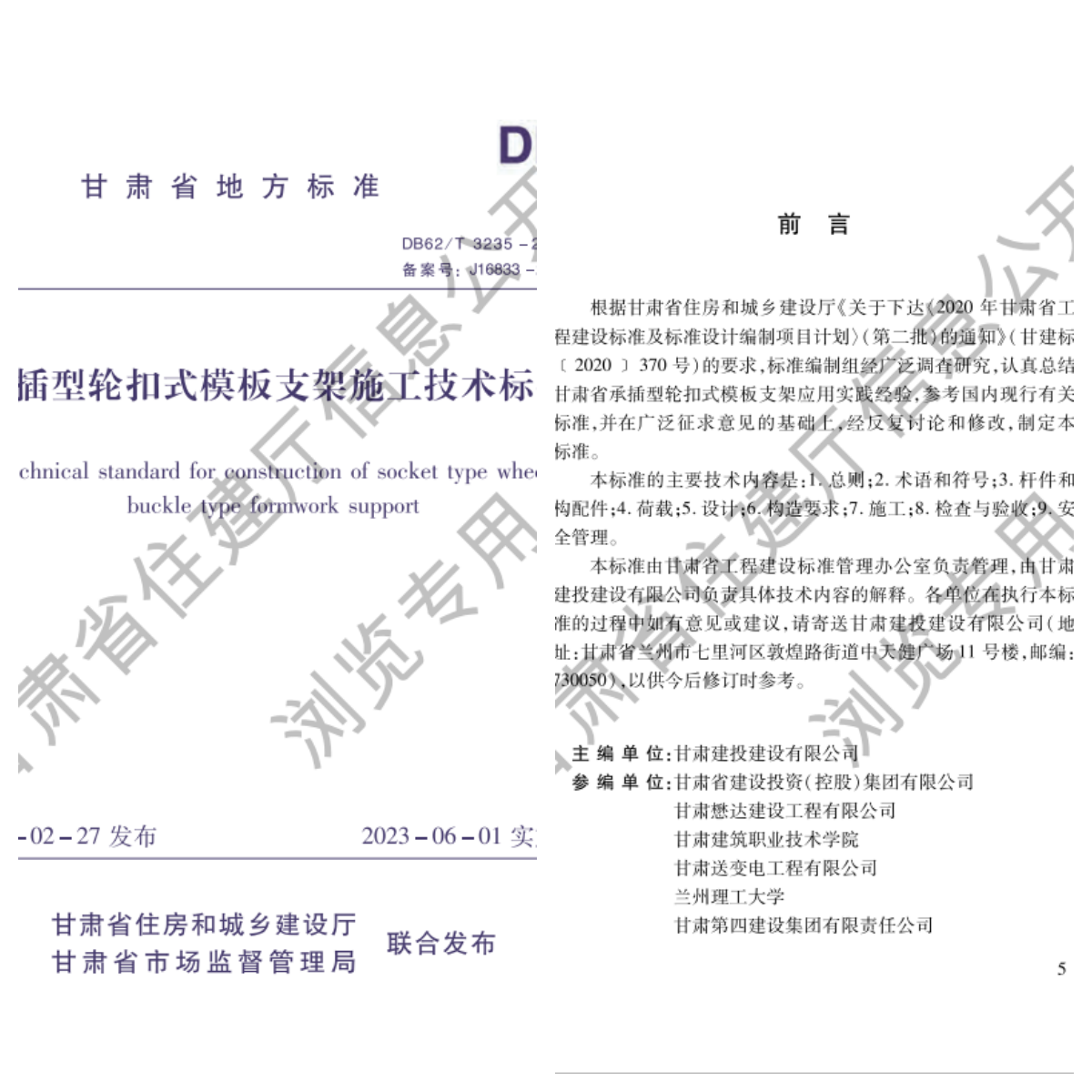 甘肅省住房和城鄉(xiāng)建設(shè)廳、甘肅省市場(chǎng)監(jiān)督管理局于近日發(fā)布公告,由公司參編的甘肅省地方標(biāo)準(zhǔn)《地面輻射供暖施工及驗(yàn)收標(biāo)準(zhǔn)》DB62/T 3231-2022 和《承插型輪扣式模板支架施工技術(shù)標(biāo)準(zhǔn)》DB62/T 3235-2023正式發(fā)布,分別于2022年12月1日和2023年6月1日起實(shí)施。